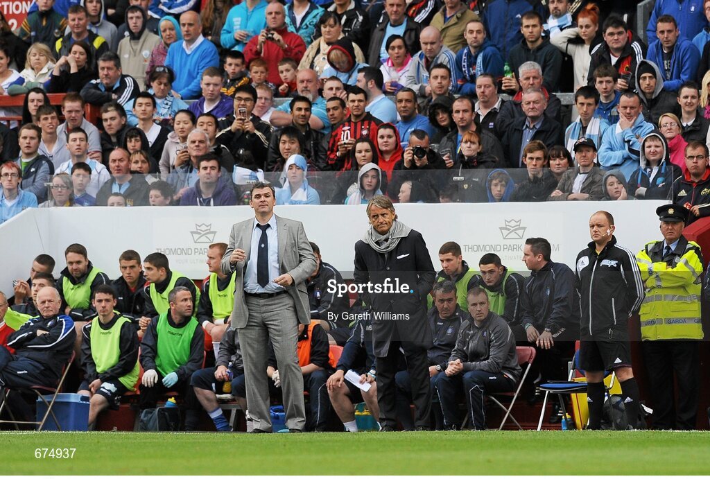 5 August 2012; Limerick manager Pat Scully, left, and Manchester City manager Roberto Mancini during the game. Soccer Friendly, Limerick FC v Manchester City, Thomond Park, Limerick. Picture credit: Gareth Williams / SPORTSFILE