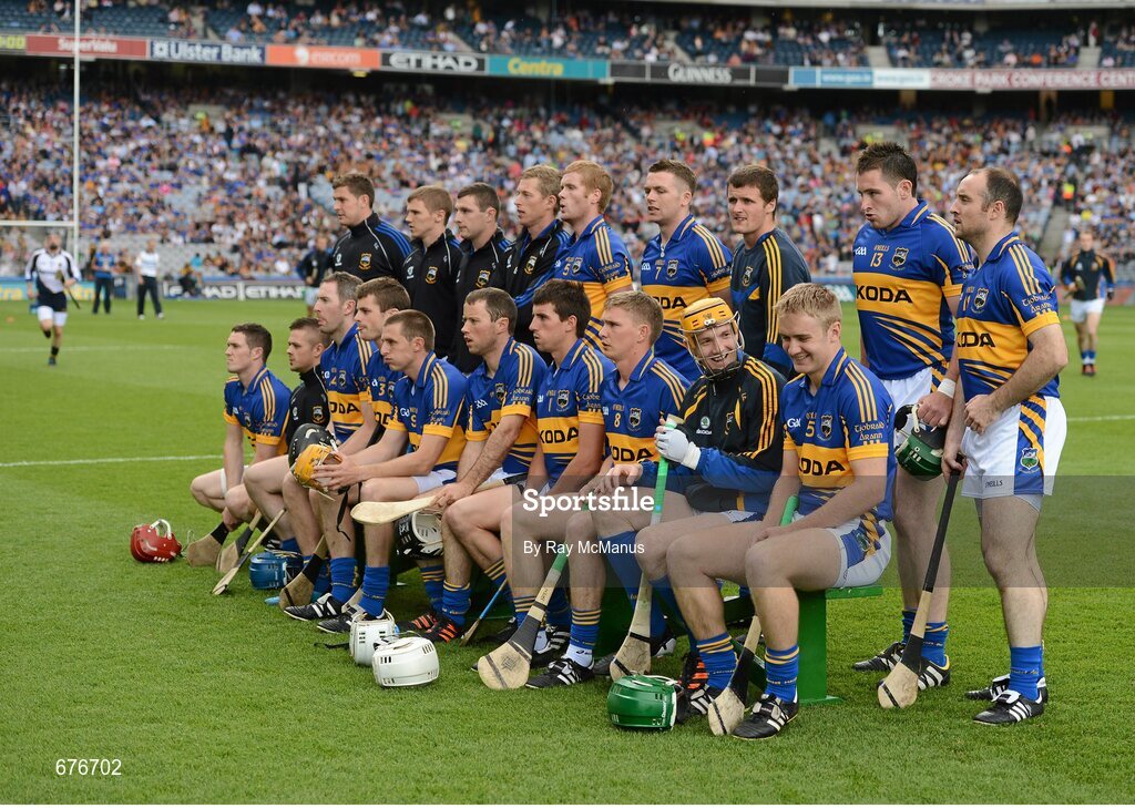 19 August 2012; Lar Corbett, second from right in the front row, chatting to Noel McGrath as members of the Tipperary team assemble for the pre match photograph. GAA Hurling All-Ireland Senior Championship Semi-Final, Kilkenny v Tipperary, Croke Park, Dublin. Picture credit: Ray McManus / SPORTSFILE