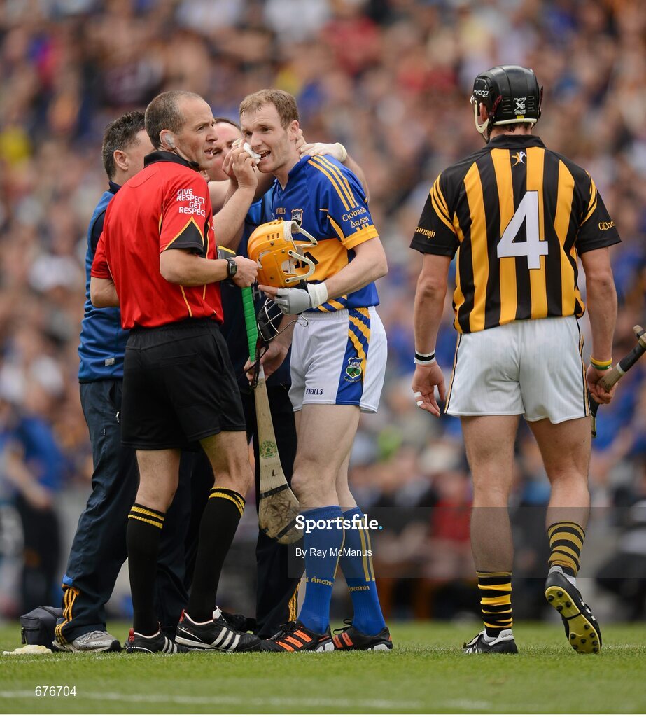 19 August 2012; Referee Cathal McAllister speaks to Lar Corbett, Tipperary, and Jackie Tyrrell early in the game. GAA Hurling All-Ireland Senior Championship Semi-Final, Kilkenny v Tipperary, Croke Park, Dublin. Picture credit: Ray McManus / SPORTSFILE