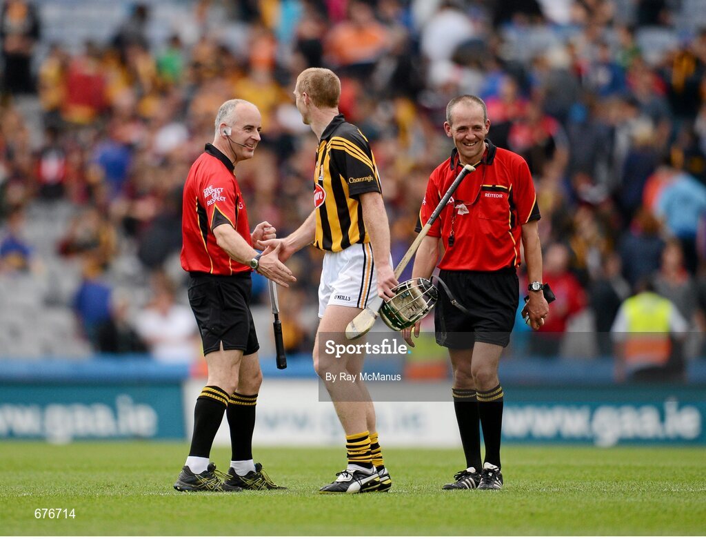 19 August 2012; Kilkenny's Henry Shefflin, who scored 11 points, shakes hands with linesman John Sexton as match referee Cathal McAllister leaves the field after the game. GAA Hurling All-Ireland Senior Championship Semi-Final, Kilkenny v Tipperary, Croke Park, Dublin. Picture credit: Ray McManus / SPORTSFILE