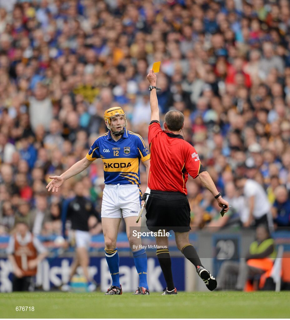 19 August 2012; Lar Corbett, Tipperary, is shown a yellow card by referee Cathal McAllister early in the second half. GAA Hurling All-Ireland Senior Championship Semi-Final, Kilkenny v Tipperary, Croke Park, Dublin. Picture credit: Ray McManus / SPORTSFILE