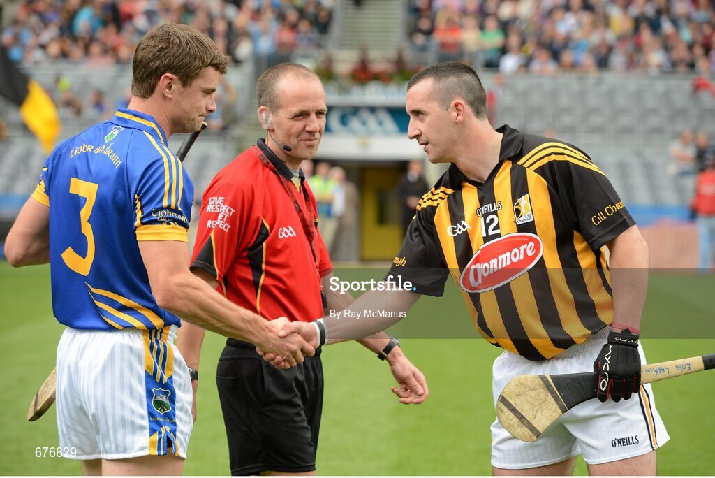 19 August 2012; The Kilkenny captain Eoin Larkin shakes hands with the Tipperary captain Paul Curran as referee Cathal McAllister looks on. GAA Hurling All-Ireland Senior Championship Semi-Final, Kilkenny v Tipperary, Croke Park, Dublin. Picture credit: Ray McManus / SPORTSFILE