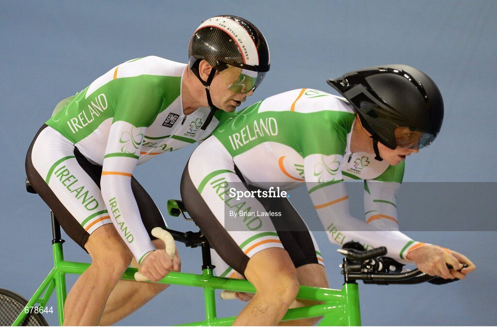 30 August 2012; Ireland's tandem pairing James Brown, from Stonehouse, England, left, and pilot Damien Shaw, from Mullingar, Co. Westmeath, compete in the qualifiying round of the men's individual B pursuit. The tandem pair finished in a time of 4:25.557 qualifying them for this afternoon's Bronze medal ride off. London 2012 Paralympic Games, Cycling, Velodrome, Olympic Park, Stratford, London, England. Picture credit: Brian Lawless / SPORTSFILE