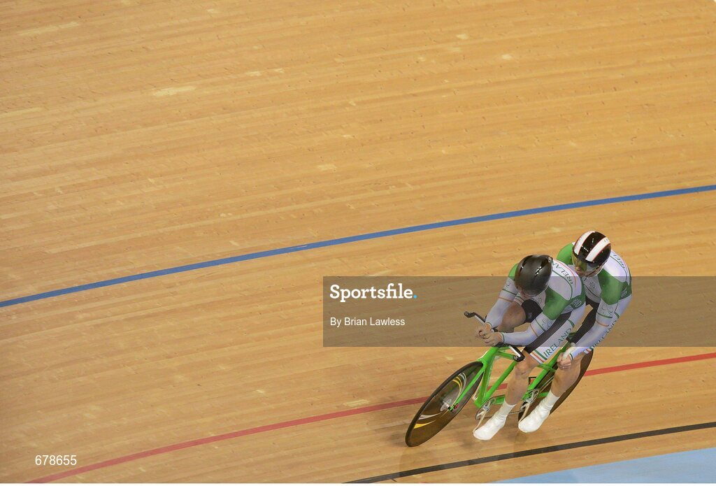 30 August 2012; Ireland's tandem pairing James Brown, from Stonehouse, England, right, and pilot Damien Shaw, from Mullingar, Co. Westmeath, compete in the qualifiying round of the men's individual B pursuit. The tandem pair finished in a time of 4:25.557 qualifying them for this afternoon's Bronze medal ride off. London 2012 Paralympic Games, Cycling, Velodrome, Olympic Park, Stratford, London, England. Picture credit: Brian Lawless / SPORTSFILE