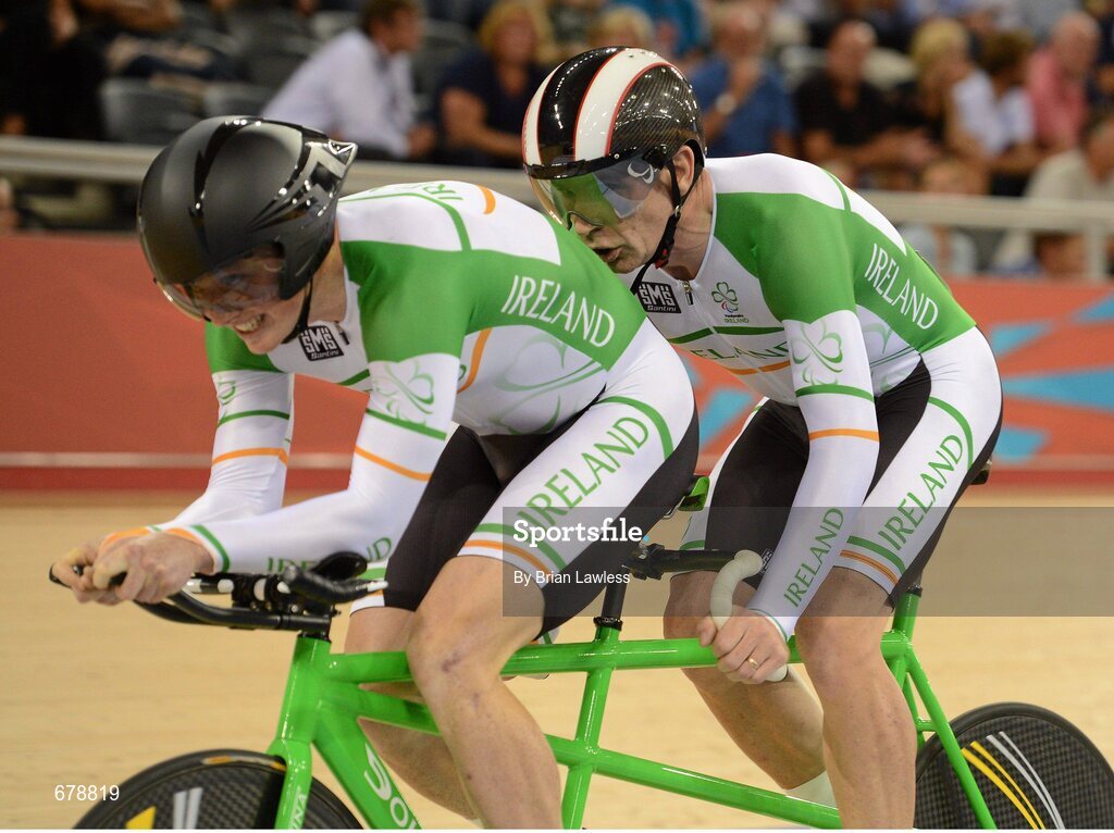 30 August 2012; Ireland's tandem pairing James Brown, from Stonehouse, England, and pilot Damien Shaw, from Mullingar, Co. Westmeath, compete in the men's individual B pursuit bronze medal final. London 2012 Paralympic Games, Cycling, Velodrome, Olympic Park, Stratford, London, England. Picture credit: Brian Lawless / SPORTSFILE