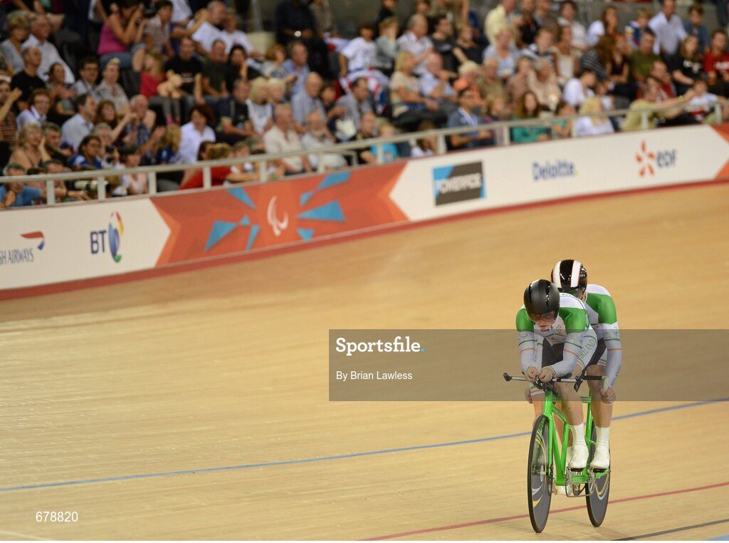 30 August 2012; Ireland's tandem pairing James Brown, from Stonehouse, England, and pilot Damien Shaw, from Mullingar, Co. Westmeath, compete in the men's individual B pursuit bronze medal final. London 2012 Paralympic Games, Cycling, Velodrome, Olympic Park, Stratford, London, England. Picture credit: Brian Lawless / SPORTSFILE