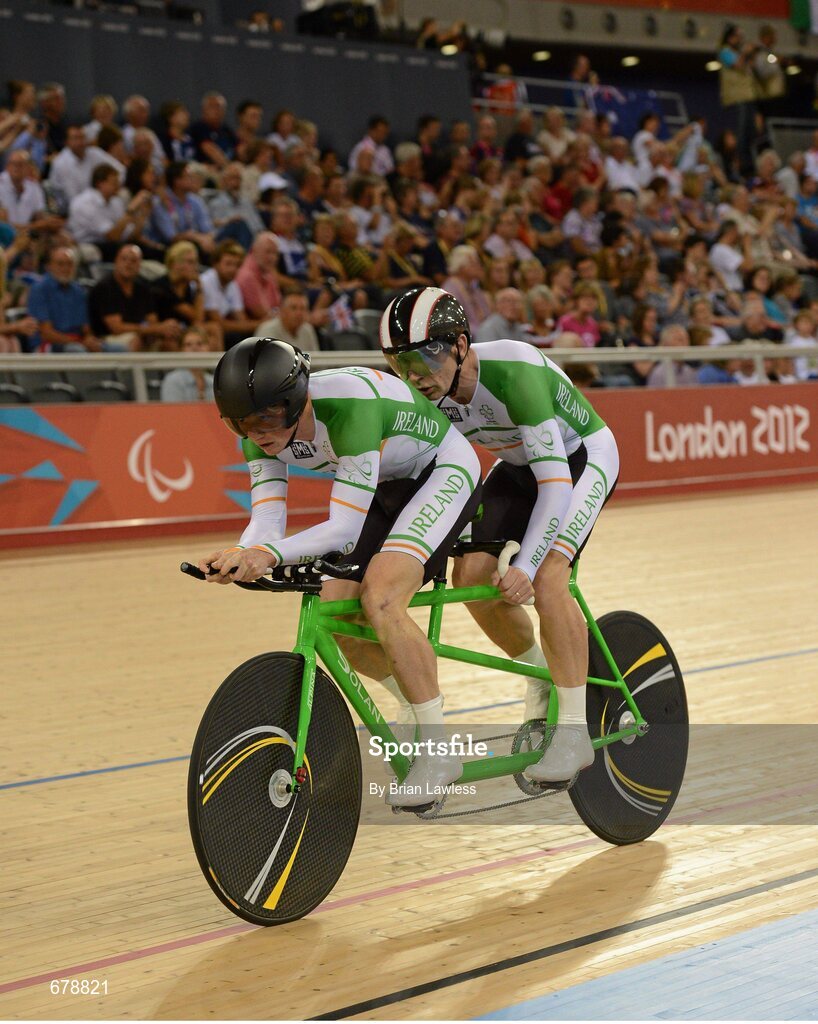 30 August 2012; Ireland's tandem pairing James Brown, from Stonehouse, England, and pilot Damien Shaw, from Mullingar, Co. Westmeath, compete in the men's individual B pursuit bronze medal final. London 2012 Paralympic Games, Cycling, Velodrome, Olympic Park, Stratford, London, England. Picture credit: Brian Lawless / SPORTSFILE