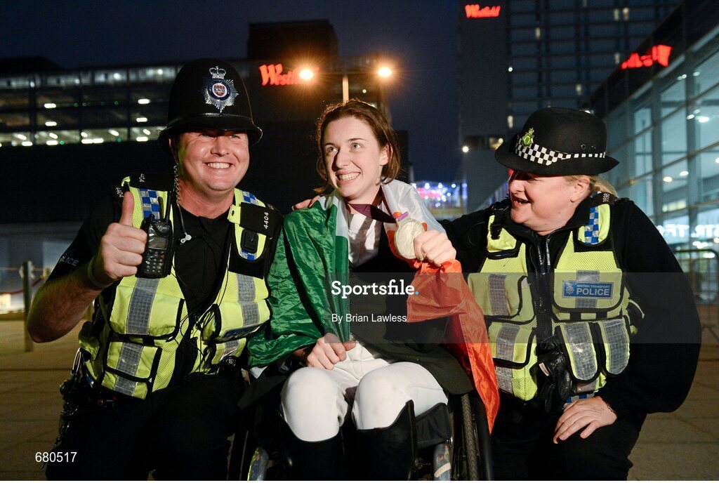 2 September 2012; Ireland's Helen Kearney, from Dunlaven, Co. Wicklow, along with PC Colm Abbott, left, and PC Liz Dales, celebrates with her silver medal for individual championship test - grade 1a. London 2012 Paralympic Games, Equestrian, Olympic Park, Stratford, London, England. Picture credit: Brian Lawless / SPORTSFILE