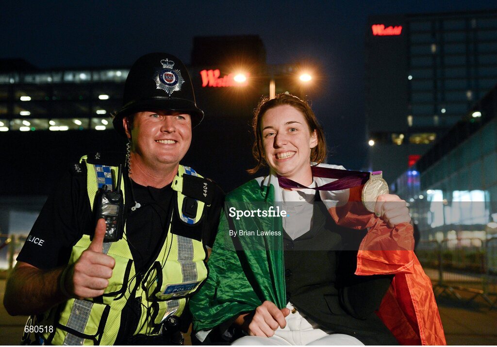 2 September 2012; Ireland's Helen Kearney, from Dunlaven, Co. Wicklow, along with PC Colm Abbott, celebrates with her silver medal for individual championship test - grade 1a. London 2012 Paralympic Games, Equestrian, Olympic Park, Stratford, London, England. Picture credit: Brian Lawless / SPORTSFILE