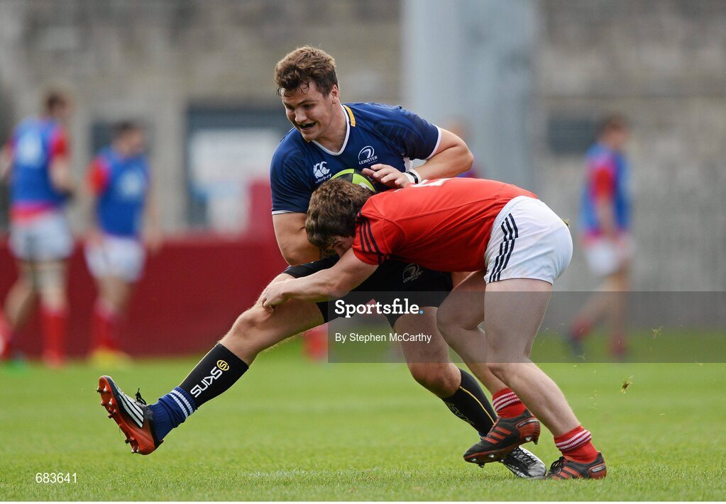 12 September 2012; Harrison Brewer, Leinster, is tackled by Luke O'Halloran, Munster. Under 18 Schools Interprovincial, Munster v Leinster, Thomond Park, Limerick. Picture credit: Stephen McCarthy / SPORTSFILE