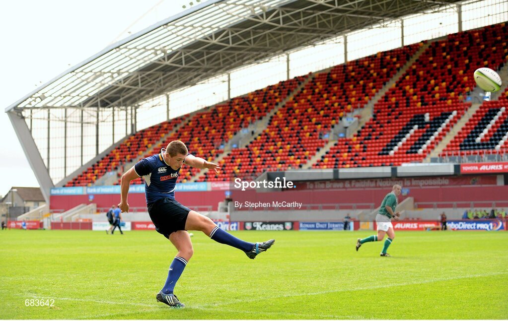 12 September 2012; Leinster's Ross Byrne kicks a first half conversion. Under 18 Schools Interprovincial, Munster v Leinster, Thomond Park, Limerick. Picture credit: Stephen McCarthy / SPORTSFILE