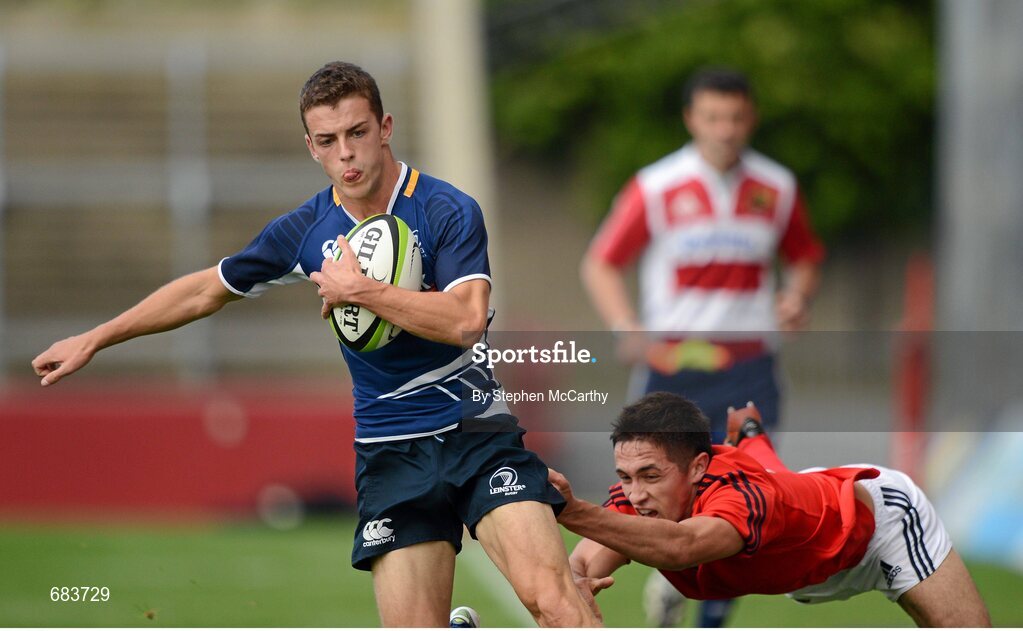 12 September 2012; James McCormack, Leinster, is tackled by Greg O'Shea, Munster. Under 18 Schools Interprovincial, Munster v Leinster, Thomond Park, Limerick. Picture credit: Stephen McCarthy / SPORTSFILE