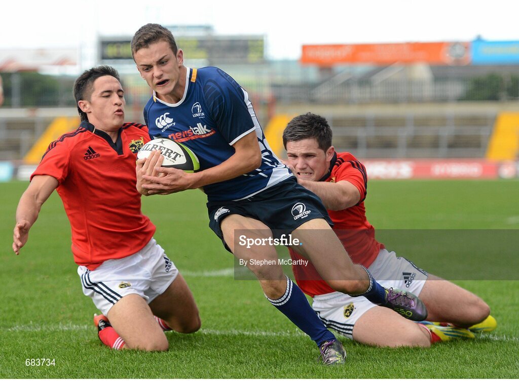 12 September 2012; James McCormack, Leinster, goes over for a try despite the tackle of Greg O'Shea, left, and Edward O'Keefe, Munster. Under 18 Schools Interprovincial, Munster v Leinster, Thomond Park, Limerick. Picture credit: Stephen McCarthy / SPORTSFILE