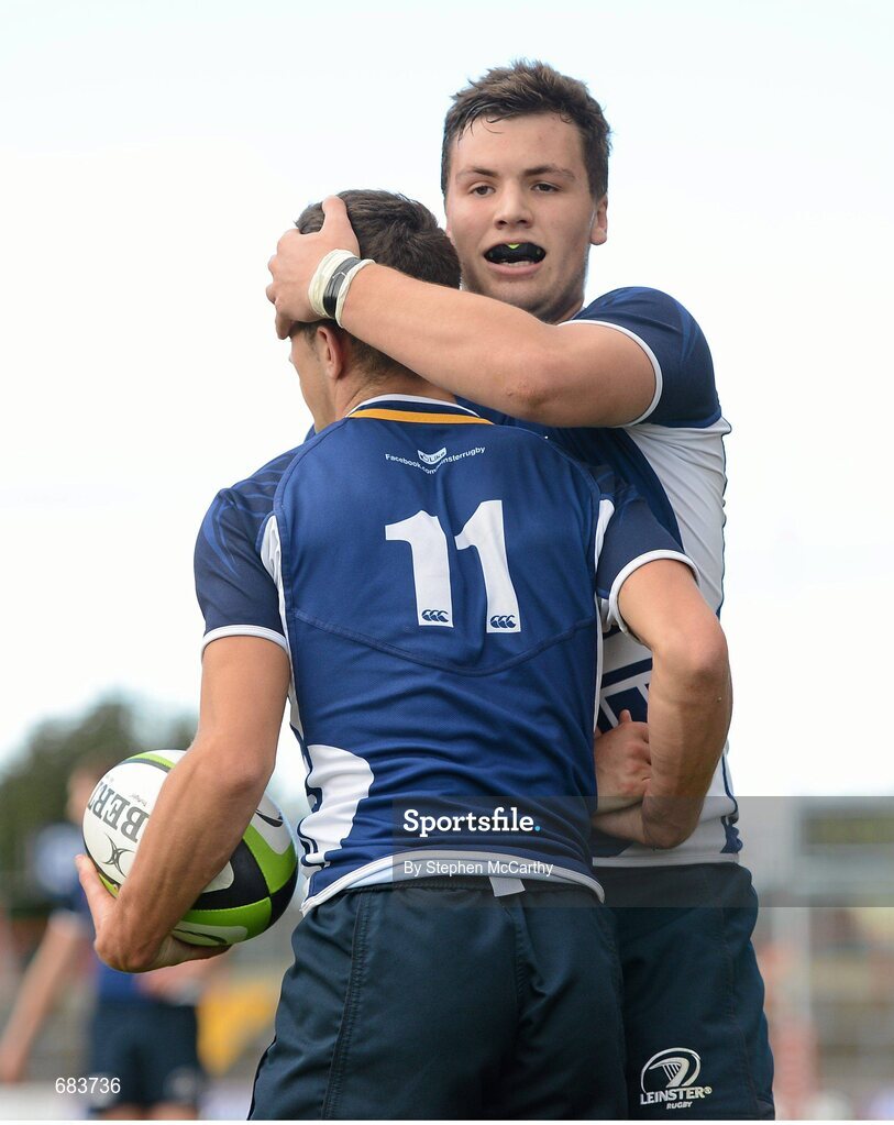 12 September 2012; James McCormack, Leinster, is congratulated by team-mate Harrison Brewer, right, after scoring a try. Under 18 Schools Interprovincial, Munster v Leinster, Thomond Park, Limerick. Picture credit: Stephen McCarthy / SPORTSFILE