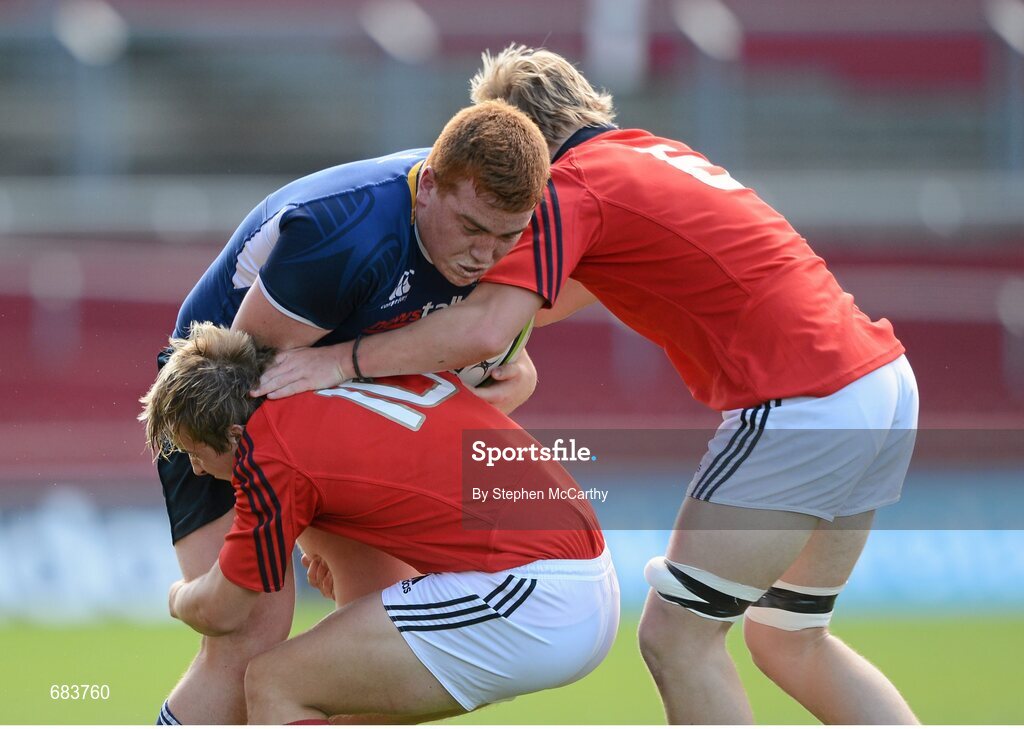 12 September 2012; Oisin Heffernan, Leinster, is tackled by Gearoid Lyons, left, and Morgan Carey, Munster. Under 18 Schools Interprovincial, Munster v Leinster, Thomond Park, Limerick. Picture credit: Stephen McCarthy / SPORTSFILE