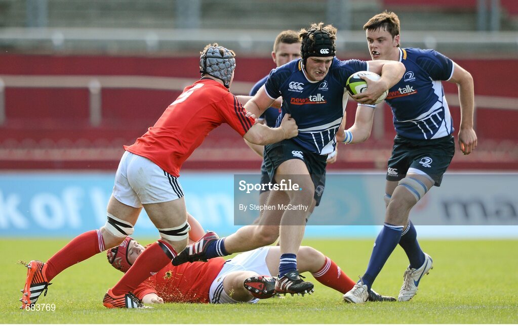 12 September 2012; Oliver Jager, Leinster, is tackled by Mike O'Donnell, Munster. Under 18 Schools Interprovincial, Munster v Leinster, Thomond Park, Limerick. Picture credit: Stephen McCarthy / SPORTSFILE