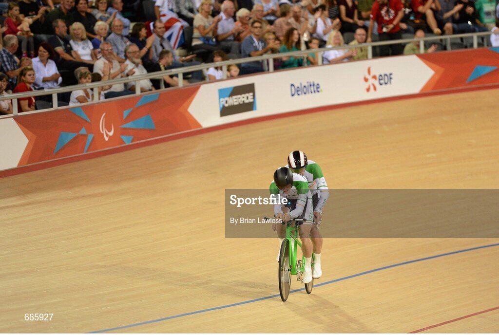 30 August 2012; Ireland's tandem pairing James Brown, from Stonehouse, England, and pilot Damien Shaw, from Mullingar, Co. Westmeath, compete in the men's individual B pursuit bronze medal final. London 2012 Paralympic Games, Cycling, Velodrome, Olympic Park, Stratford, London, England. Picture credit: Brian Lawless / SPORTSFILE