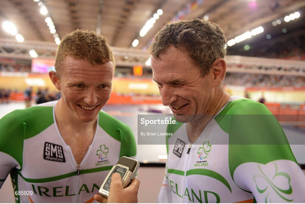 30 August 2012; Ireland's tandem pairing James Brown, from Stonehouse, England, right, and pilot Damien Shaw, from Mullingar, Co. Westmeath, after the men's individual B pursuit bronze medal final which they lost to Spain. London 2012 Paralympic Games, Cycling, Velodrome, Olympic Park, Stratford, London, England. Picture credit: Brian Lawless / SPORTSFILE