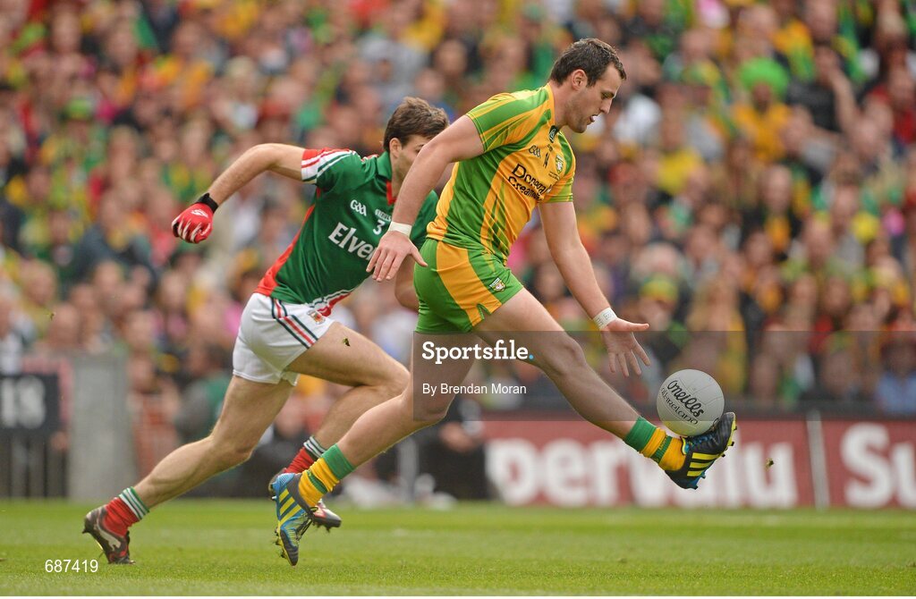 23 September 2012; Michael Murphy, Donegal, in action against Ger Cafferkey, Mayo. GAA Football All-Ireland Senior Championship Final, Donegal v Mayo, Croke Park, Dublin. Picture credit: Brendan Moran / SPORTSFILE