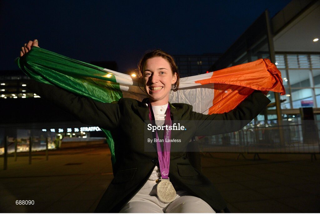 2 September 2012; Ireland's Helen Kearney, from Dunlaven, Co. Wicklow, celebrates with her silver medal for individual championship test - grade Ia. London 2012 Paralympic Games, Equestrian, Stratford International Station, Stratford, London, England. Picture credit: Brian Lawless / SPORTSFILE