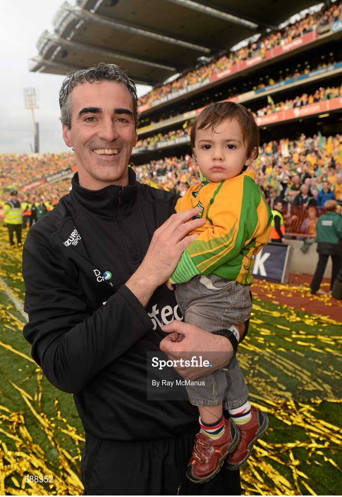 23 September 2012; Donegal manager Jim McGuinness, with his son Jimmy, age 8 months, celebrates after the game. GAA Football All-Ireland Senior Championship Final, Donegal v Mayo, Croke Park, Dublin. Picture credit: Ray McManus / SPORTSFILE