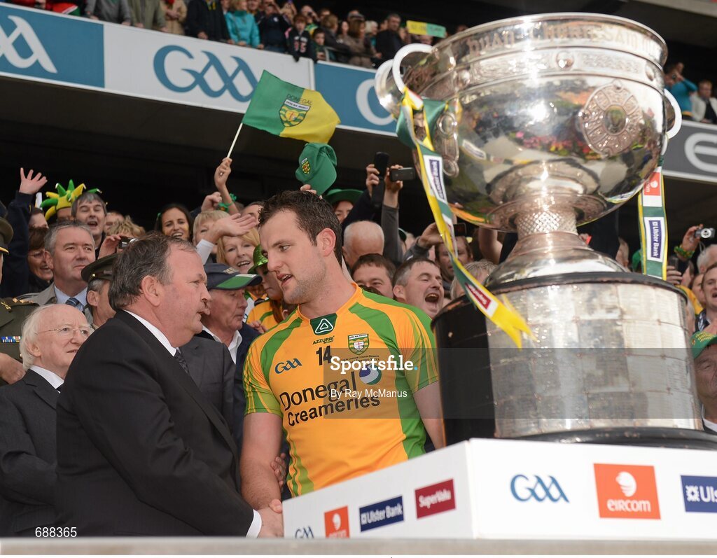 23 September 2012; Donegal captain Michael Murphy shakes hands with Uachtarán Chumann Lúthchleas Gael Liam Ó Néill while Michael D. Higgins, President of Ireland looks on, before the presentation of the Sam Maguire Cup. GAA Football All-Ireland Senior Championship Final, Donegal v Mayo, Croke Park, Dublin. Picture credit: Ray McManus / SPORTSFILE
