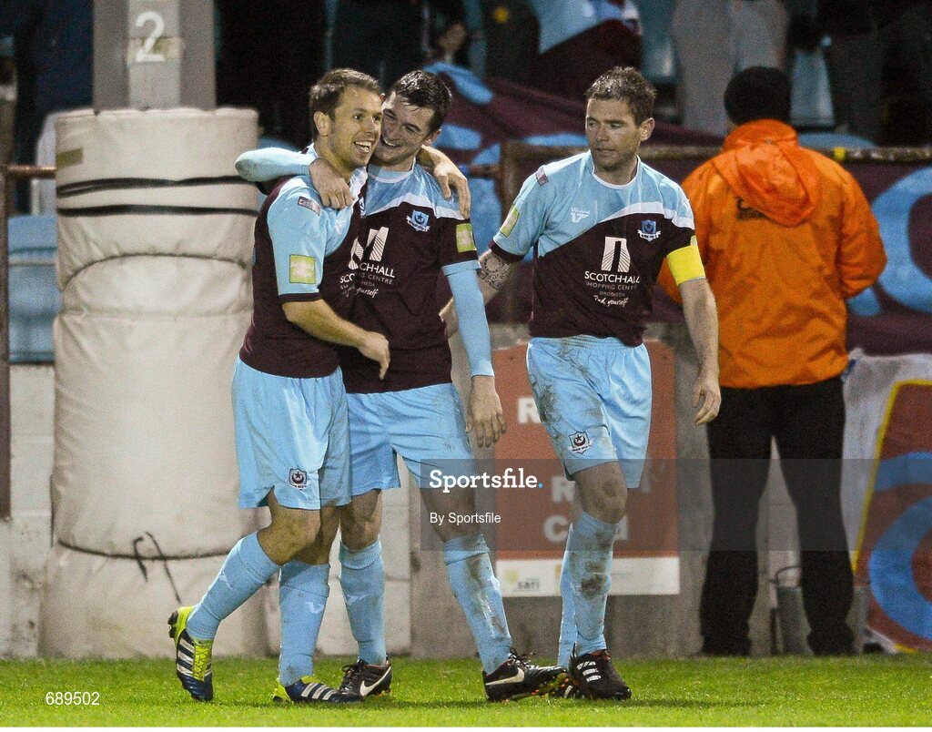 1 October 2012; Ryan Brennan, Drogheda United, is congratulated by team-mates Declan O'Brien, left, and Paul Crowley, right, after scoring his side's second goal. Airtricity League Premier Division, Drogheda United v Shelbourne, Hunky Dory Park, Drogheda, Co. Louth. Photo by Sportsfile