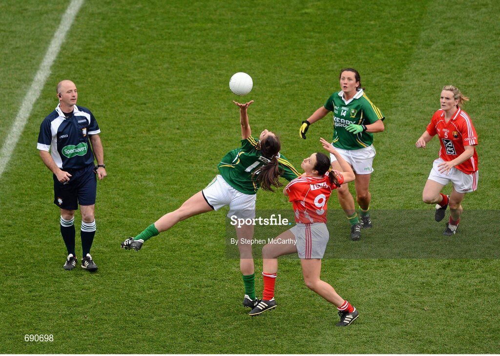 7 October 2012; Referee Gavin Corrigan watches on as Emma Sherwood, Kerry, and Norita Kelly, Cork, contest a 'hop ball' with support from team-mates Deirdre Corridan, Kerry, and Briege Corkery, Cork. TG4 All-Ireland Ladies Football Senior Championship Final, Cork v Kerry, Croke Park, Dublin. Picture credit: Stephen McCarthy / SPORTSFILE