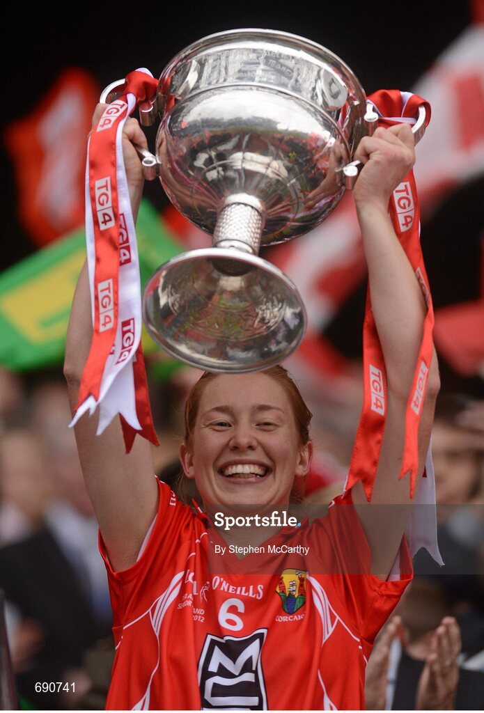 7 October 2012; Cork captain Rena Buckley lifts the Brendan Martin Cup. TG4 All-Ireland Ladies Football Senior Championship Final, Cork v Kerry, Croke Park, Dublin. Picture credit: Stephen McCarthy / SPORTSFILE