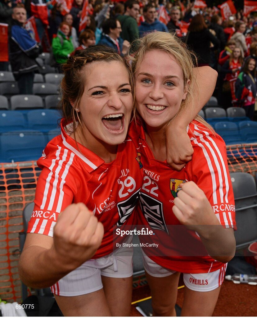 7 October 2012; Sarah Harrington, left, and Orla Finn, Cork, celebrate their side's victory. TG4 All-Ireland Ladies Football Senior Championship Final, Cork v Kerry, Croke Park, Dublin. Picture credit: Stephen McCarthy / SPORTSFILE