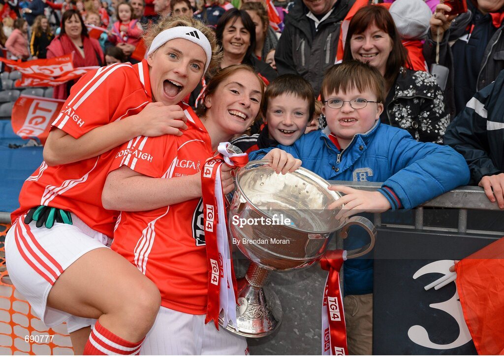 7 October 2012; Cork players Valerie Mulcahy, left, and Riona Ní Bhuachalla celebrate with the Brendan Martin Cup after the game. TG4 All-Ireland Ladies Football Senior Championship Final, Cork v Kerry, Croke Park, Dublin. Picture credit: Brendan Moran / SPORTSFILE