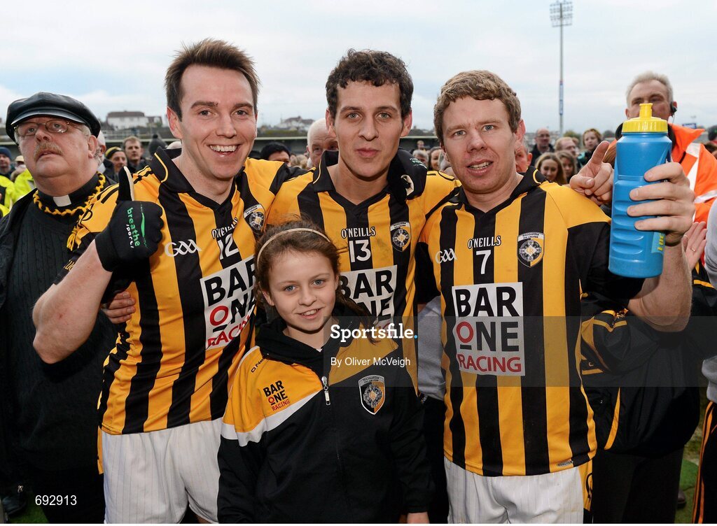 14 October 2012; Tony Kernan, Jamie Clarke and Martin Aherne, Crossmaglen Rangers, celebrate along with Jamie's sister Alex Clarke. Armagh County Senior Football Championship Final, Crossmaglen Rangers v Pearse Og, Morgan Athletic Grounds, Armagh. Picture credit: Oliver McVeigh / SPORTSFILE