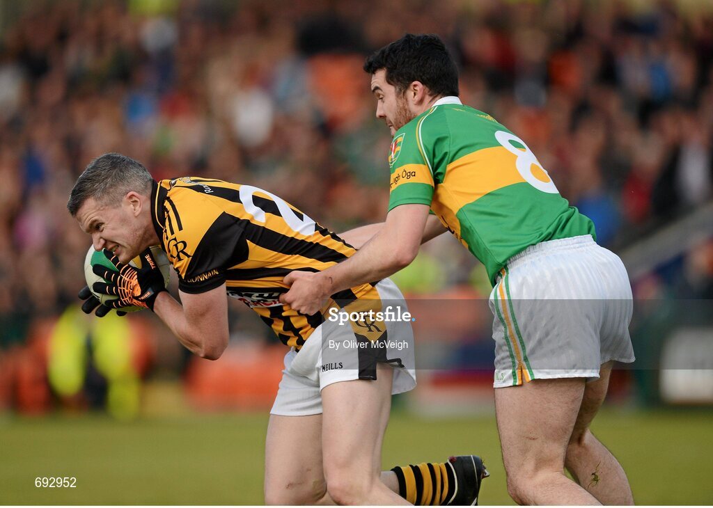 14 October 2012; Brendan McKeown, Crossmaglen Rangers, in action against Chris Rafferty, Pearse Og. Armagh County Senior Football Championship Final, Crossmaglen Rangers v Pearse Og, Morgan Athletic Grounds, Armagh. Picture credit: Oliver McVeigh / SPORTSFILE