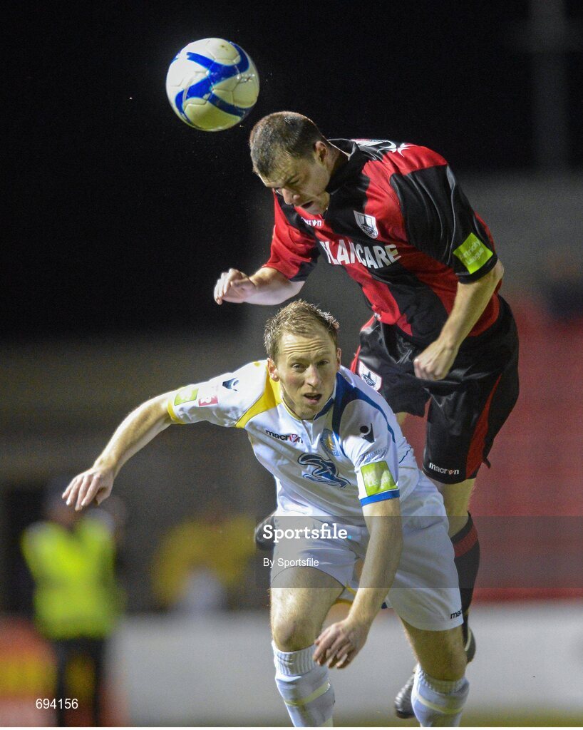 20 October 2012; Noel Haverty, Longford Town, in action against Paul Phelan, Waterford United. Airtricity League First Division Promotion Play-Off, 1st Leg, Longford Town v Waterford United, Flancare Park, Co. Longford. Photo by Sportsfile