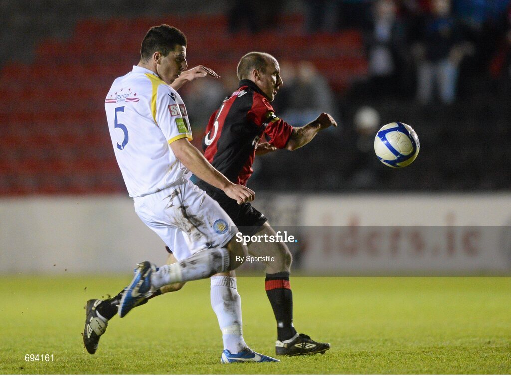20 October 2012; Alan Kirby, Longford Town, in action against Craig Burns, Waterford United. Airtricity League First Division Promotion Play-Off, 1st Leg, Longford Town v Waterford United, Flancare Park, Co. Longford. Photo by Sportsfile