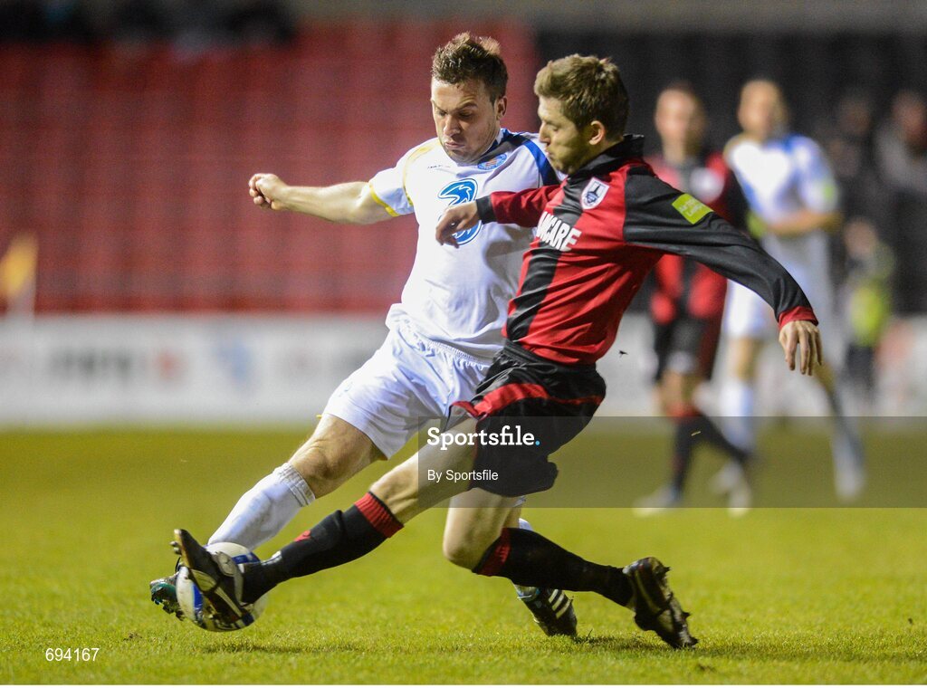 20 October 2012; Peter Higgins, Waterford United, in action against Gary Cronin, Longford Town. Airtricity League First Division Promotion Play-Off, 1st Leg, Longford Town v Waterford United, Flancare Park, Co. Longford. Photo by Sportsfile