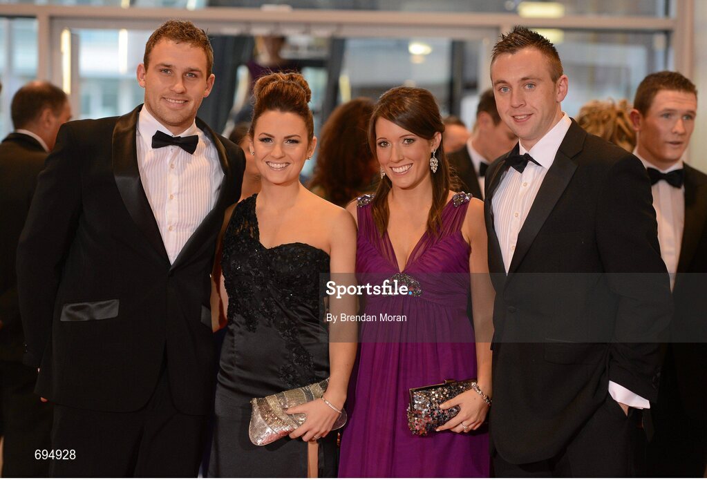 26 October 2012; Cork footballers Ciaran Sheehan, left, and Paul Kerrigan with Amy Hartnett, left, and Laura Cotter ahead of the 2012 GAA GPA All-Star awards, sponsored by Opel. National Convention Centre, Dublin. Picture credit: Brendan Moran / SPORTSFILE