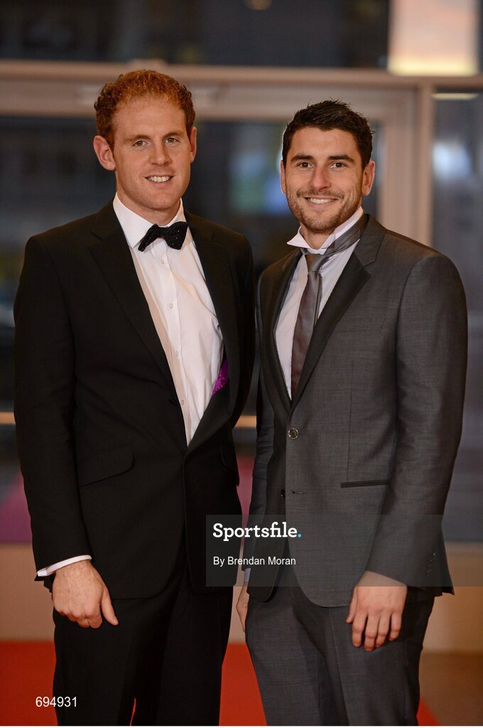 26 October 2012; Waterford hurler Kevin Moran, left, and Dublin footballer Bernard Brogan arrive ahead of the 2012 GAA GPA All-Star awards, sponsored by Opel. National Convention Centre, Dublin. Picture credit: Brendan Moran / SPORTSFILE