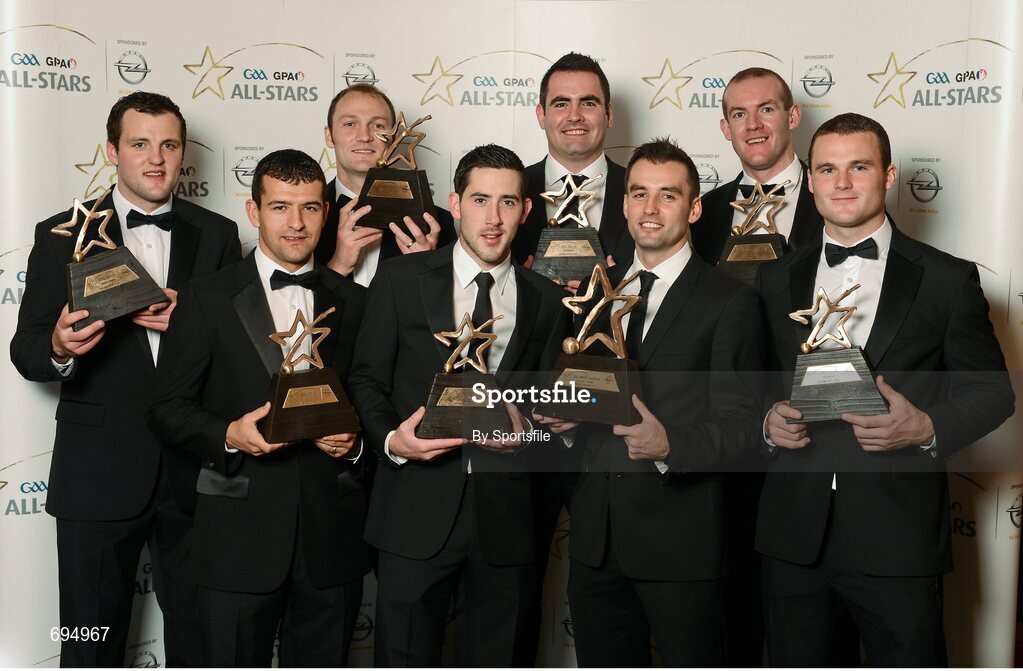 26 October 2012; GAA GPA All-Star Football awards recipients from Donegal, from left, Michael Murphy, Frank McGlynn, Colm McFadden, Mark McHugh, Paul Durcan, GAA GPA All-Star Footballer of the Year Karl Lacey, Neil Gallagher and Neil McGee at the GAA GPA All-Star Awards 2012, Sponsored by Opel. National Convention Centre, Dublin. Photo by Sportsfile