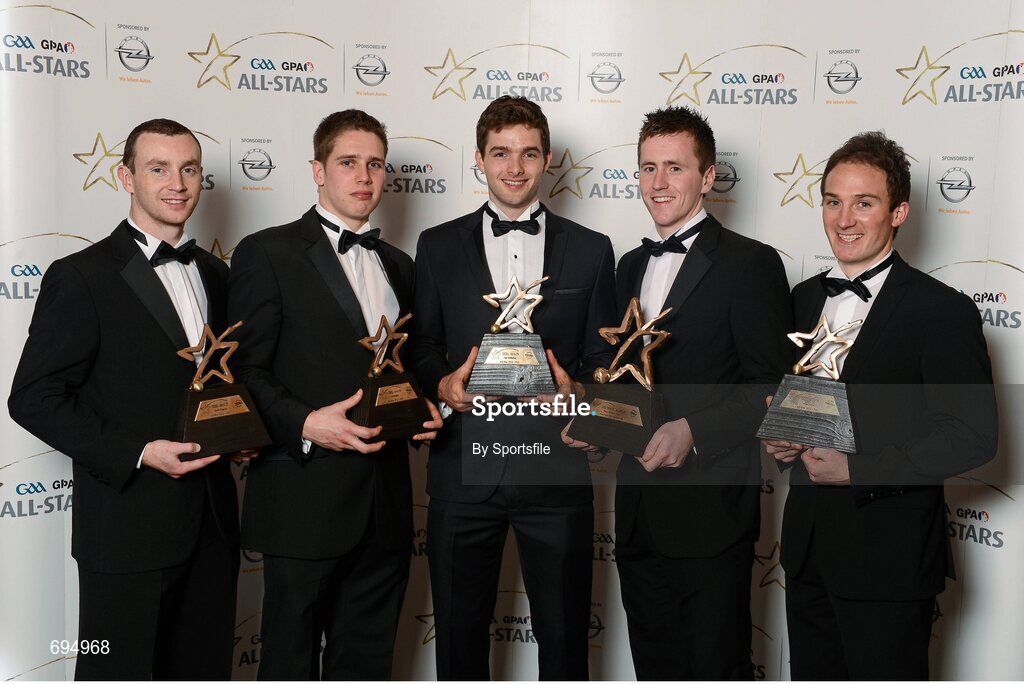 26 October 2012; GAA GPA All-Star Football awards recipients from Mayo, from left, Keith Higgins, Lee Keegan, Ger Cafferkey, GAA GPA All-Star Young Footballer of the Year Cillian O'Connor and Alan Dillon at the GAA GPA All-Star Awards 2012, Sponsored by Opel. National Convention Centre, Dublin. Photo by Sportsfile