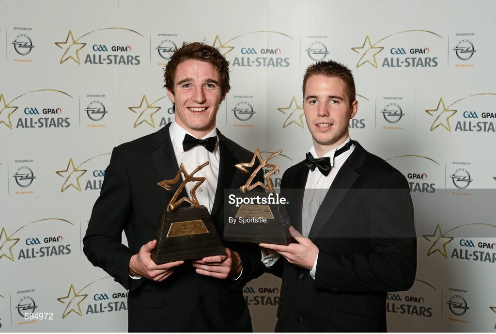 26 October 2012; Cork recipients Aidan Walsh, left, and Colm O'Neill with their 2012 GAA GPA All-Star Football awards, at the GAA GPA All-Star Awards 2012, Sponsored by Opel, National Convention Centre, Dublin. Photo by Sportsfile