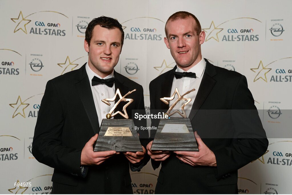 26 October 2012; Donegal footballers Michael Murphy, left, and Neil Gallagher with their 2012 GAA GPA All-Star Football award, at the GAA GPA All-Star Awards 2012, Sponsored by Opel, National Convention Centre, Dublin. Photo by Sportsfile
