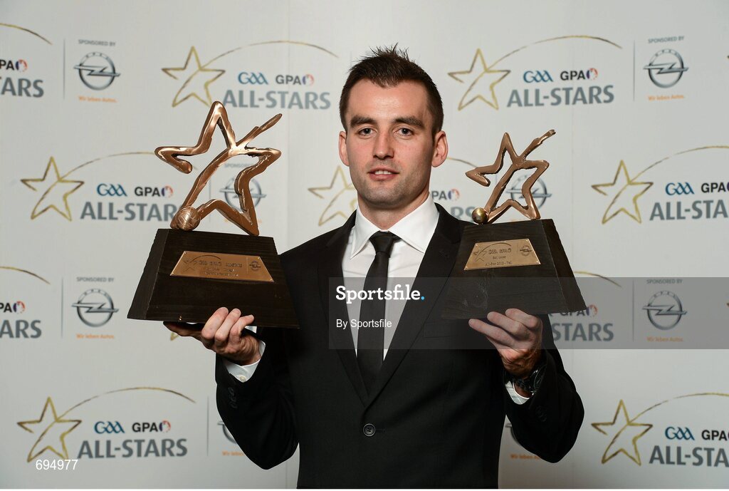 26 October 2012; GAA GPA All-Star Footballer of the Year Karl Lacey, Donegal, with both of his awards at the GAA GPA All-Star Awards 2012, Sponsored by Opel, National Convention Centre, Dublin. Photo by Sportsfile