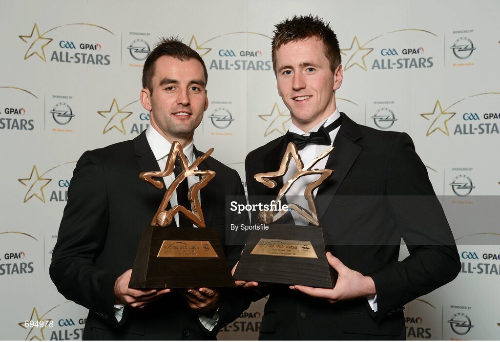 26 October 2012; GAA GPA All-Star Footballer of the Year Karl Lacey, Donegal, and GAA GPA All-Star Young Footballer of the Year Cillian O'Connor, Mayo, with their awards at the GAA GPA All-Star Awards 2012, Sponsored by Opel, National Convention Centre, Dublin. Photo by Sportsfile