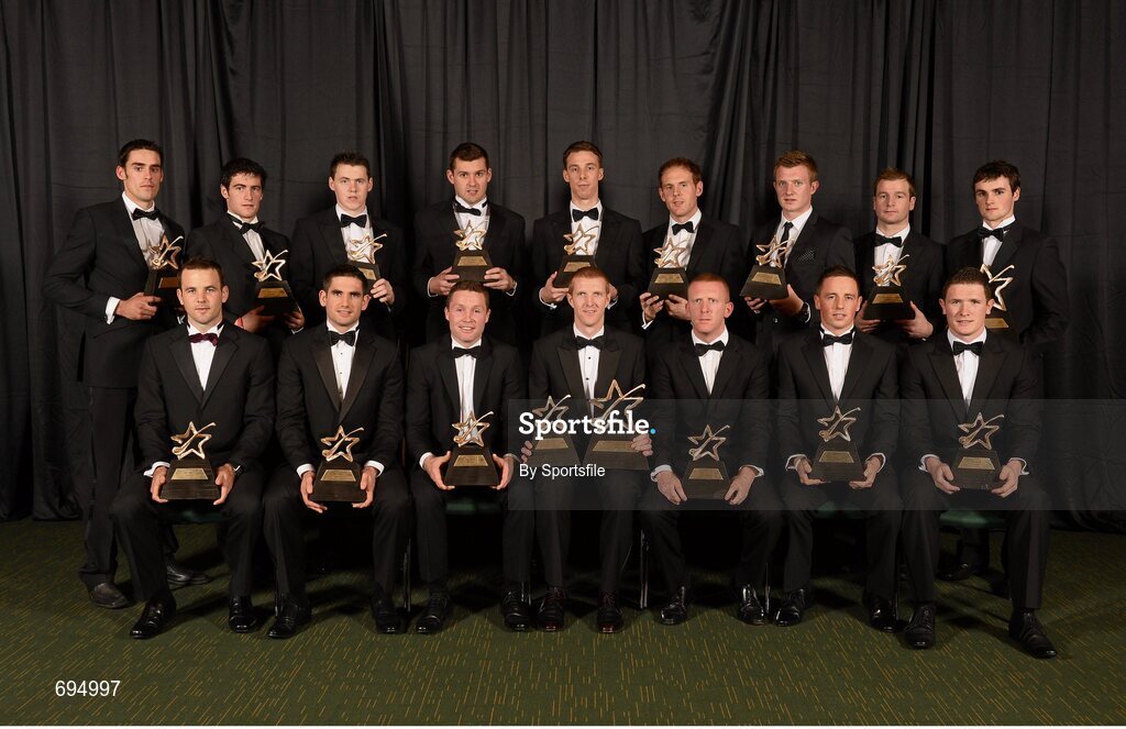 26 October 2012; The GAA GPA All-Star Hurling Team of the Year, back row, from left, Brendan Bugler, Clare, David Burke, Galway, TJ Reid, Kilkenny, Iarla Tannian, Galway, Brian Hogan, Kilkenny, Kevin Moran, Waterford, Joe Canning, Galway, JJ Delaney, Kilkenny, and GAA GPA All-Star Young Hurler of the Year Johnny Coen, Galway, with, front row, from left, David Collins, Galway, Fergal Moore, Galway, Daminen Hayes, Galway, GAA GPA All-Star Hurler of the Year Henry Shefflin, Kilkenny, John Mullane, Waterford, Anthony Nash, Cork, and Paul Murphy, Kilkenny, at the GAA GPA All-Star Awards 2012, Sponsored by Opel, National Convention Centre, Dublin. Photo by Sportsfile