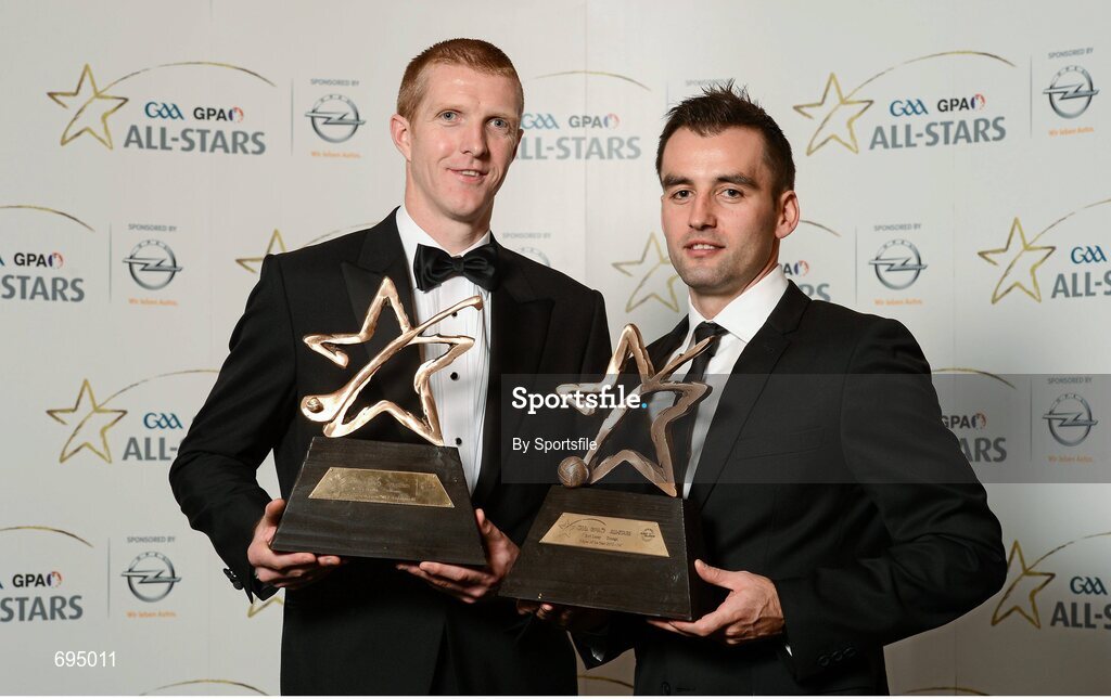 26 October 2012; GAA GPA All-Star Hurler of the Year Henry Shefflin, Kilkenny, left, and GAA GPA All-Star Footballer of the Year Karl Lacey, Donegal, at the GAA GPA All-Star Awards 2012, Sponsored by Opel, National Convention Centre, Dublin. Photo by Sportsfile
