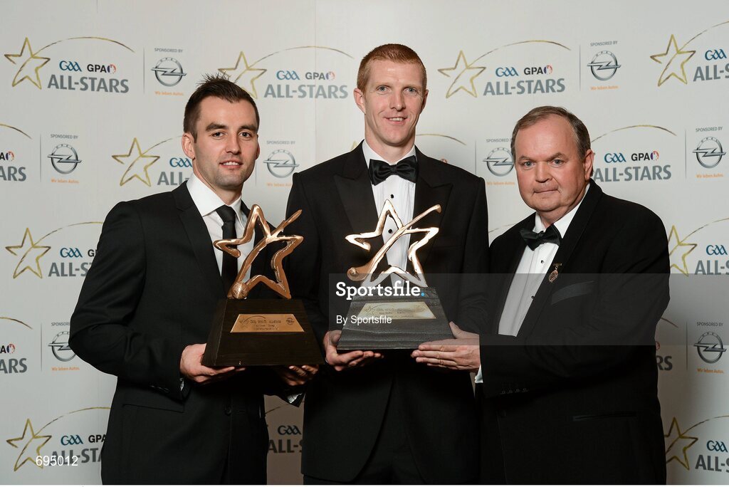 26 October 2012; Liam Ó Néill, Uachtarán, Chumann Lúthchleas Gael, with GAA GPA All-Star Footballer of the Year Karl Lacey, Donegal, left, and GAA GPA All-Star Hurler of the Year Henry Shefflin, Kilkenny, at the GAA GPA All-Star Awards 2012, Sponsored by Opel, National Convention Centre, Dublin. Photo by Sportsfile