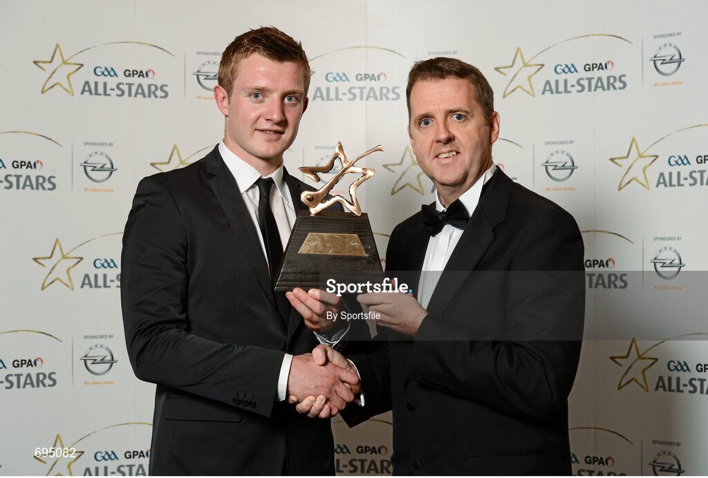 26 October 2012; Dave Sheeran, Managing Director, Opel Ireland, presents Joe Canning, Galway, with his 2012 GAA GPA All-Star Hurling award, at the GAA GPA All-Star Awards 2012, Sponsored by Opel, National Convention Centre, Dublin. Photo by Sportsfile