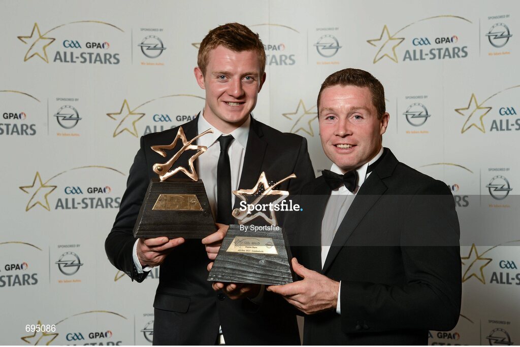 26 October 2012; Galway's Joe Canning, left, and Damien Hayes with their 2012 GAA GPA All-Star Hurling awards, at the GAA GPA All-Star Awards 2012, Sponsored by Opel, National Convention Centre, Dublin. Photo by Sportsfile