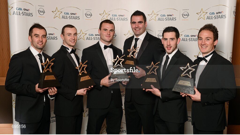 26 October 2012; Students and alumini of Sligo IT, from left, Karl Lacey, Donegal, Keith Higgins, Mayo, Neil McGee, Doengal, Paul Durcan, Donegal, Mark McHugh, Donegal, and Alan Dillon, Mayo, with their 2012 GAA GPA All-Star Football awards, at the GAA GPA All-Star Awards 2012, Sponsored by Opel, National Convention Centre, Dublin. Photo by Sportsfile